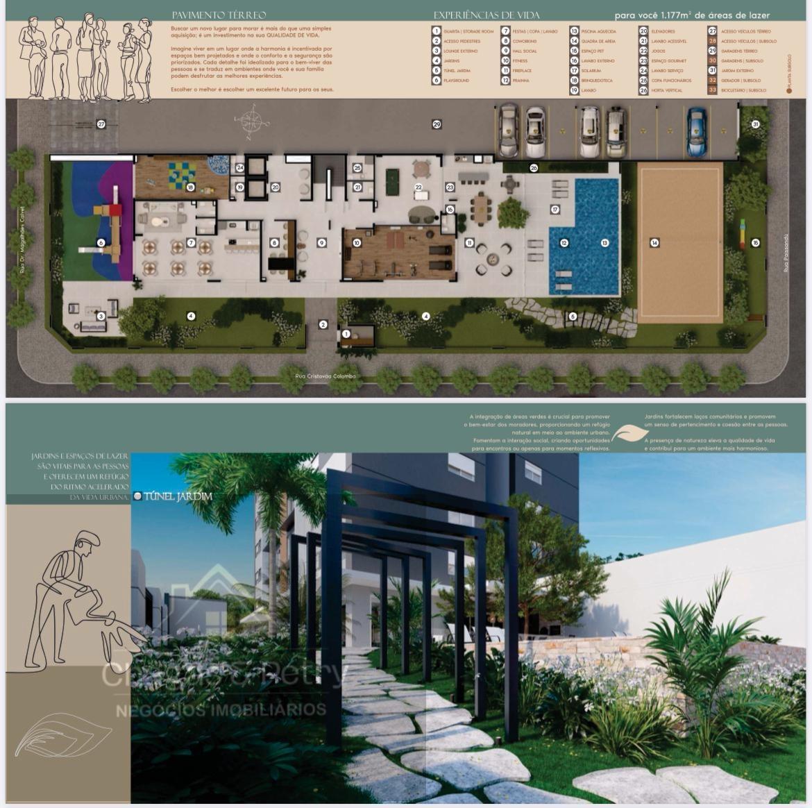 acesso pedestres, piscina, casa de máquinas, solarium, playground, jardins, varandas, hall social, hall